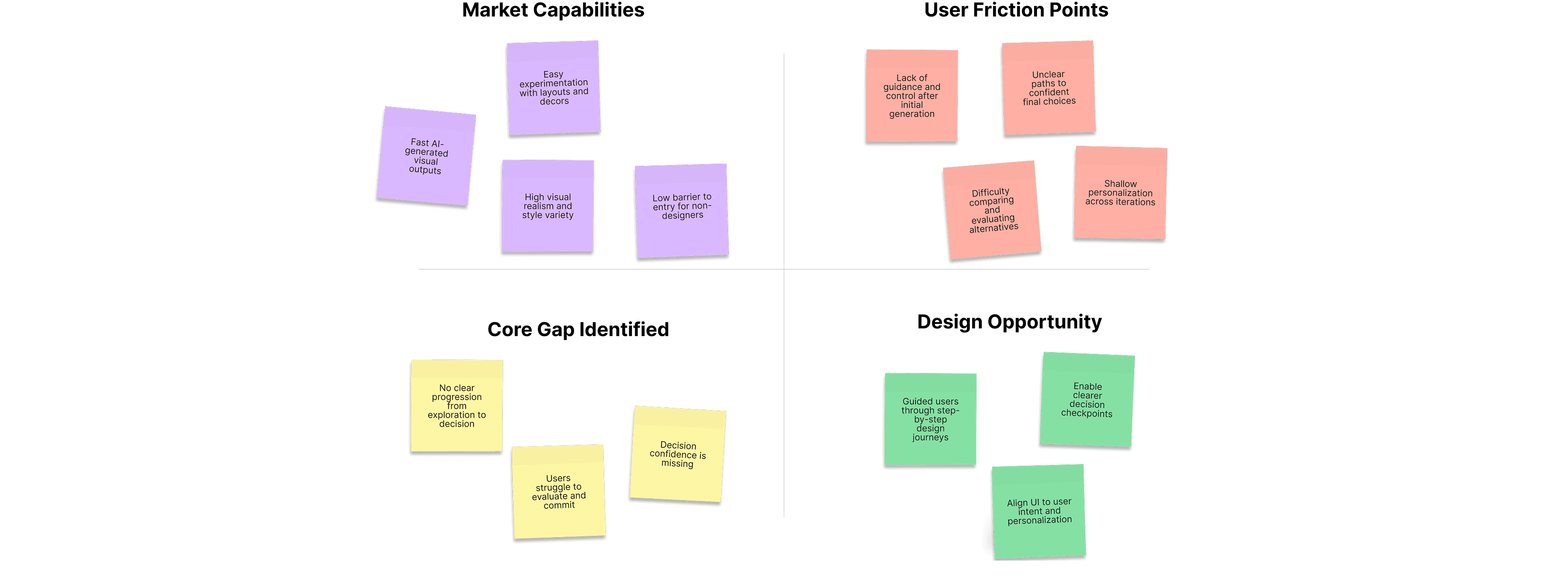 AI-based design tools optimized for fast generation, but users struggled to evaluate options, understand what to refine, or know when a design was “good enough” to commit to. Speed increased outputs, but not decision confidence.